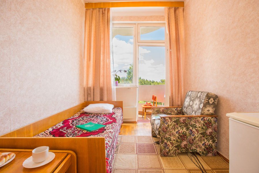 Минимализм таких номеров позволит почувствовать одному гостю санатория довольно комфортно, благодаря наличию санузла с душевой кабиной, удобной мебели и холодильника с телевизором, а также балкона с отличным видом на природу.
